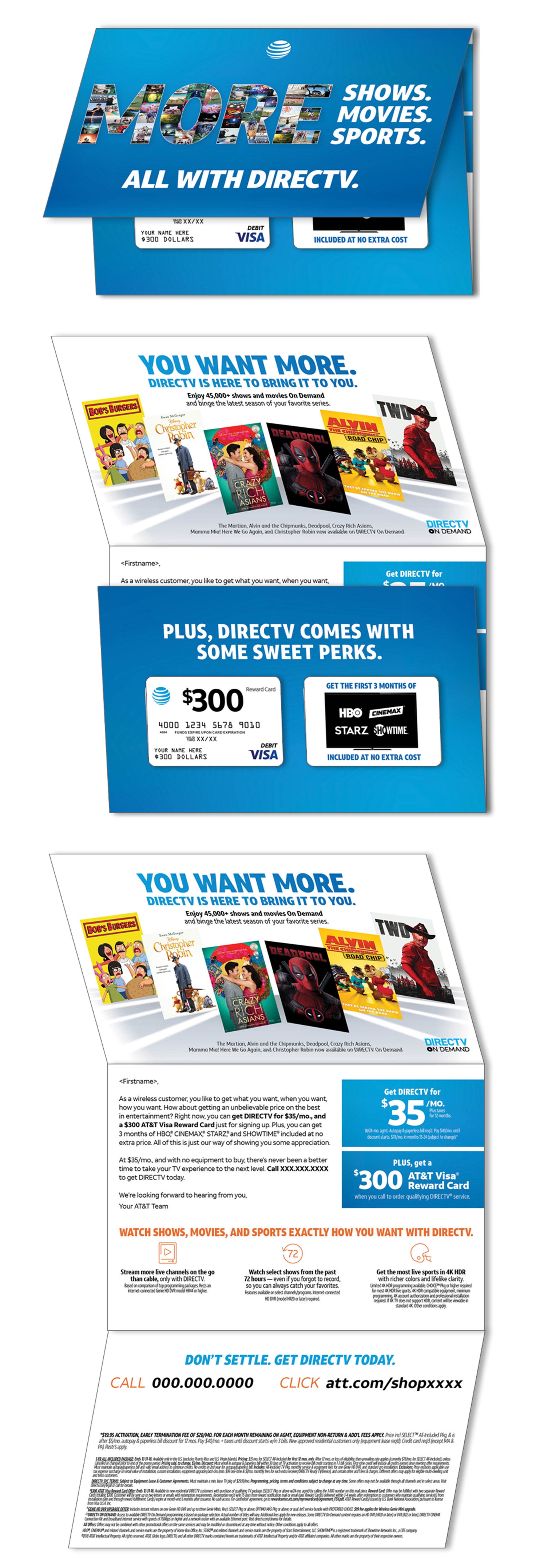 I worked across a variety of direct marketing campaigns for DIRECTV and AT&T—everything from emails and customer journeys to interactive direct mail. Whether highlighting entertainment perks or promoting new features, I helped bring each message to life through thoughtful design, clear storytelling, and creative collaboration.